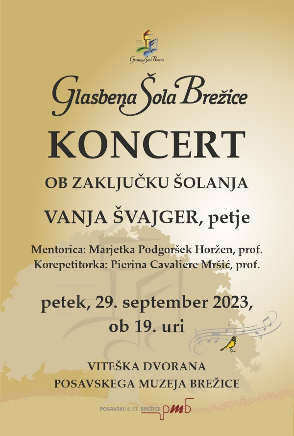 Vljudno vabljeni na Koncert ob zaključku šolanja Vanje Švajger, petje, ki bo v petek., 29. septembra 2023 v Viteški dvorani Posavskega muzeja Brežice.